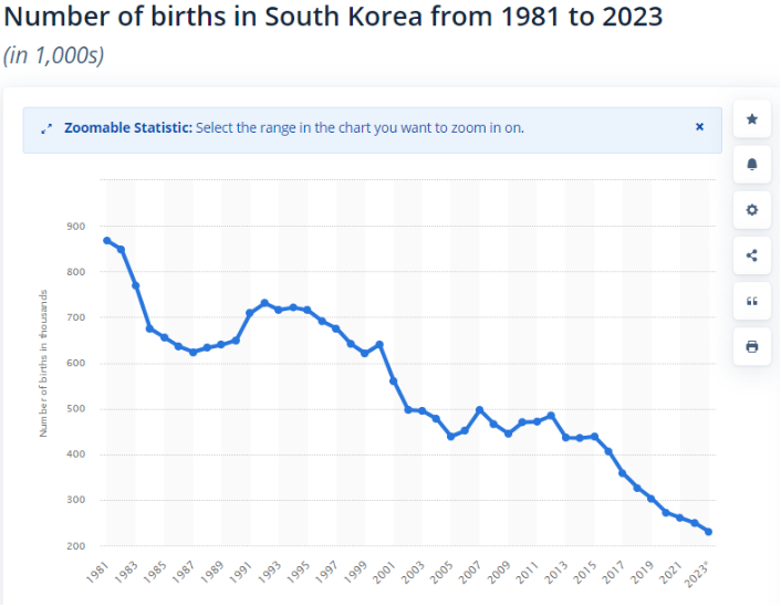 1981年~2023年韩国出身东说念主数走势/图源:MacroTrends