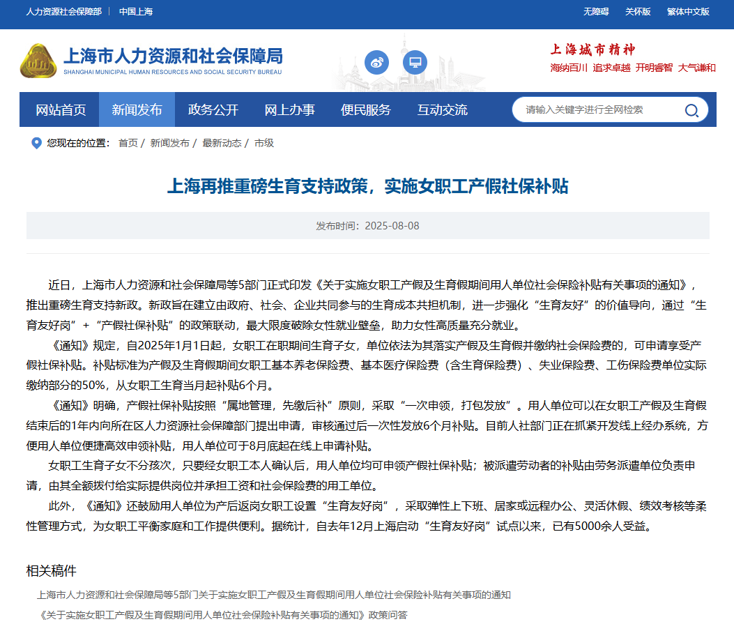 上海再推重磅生育救助计策,实施女员工产假社保补贴/截图自上海市东说念主力资源和社会保障局官网