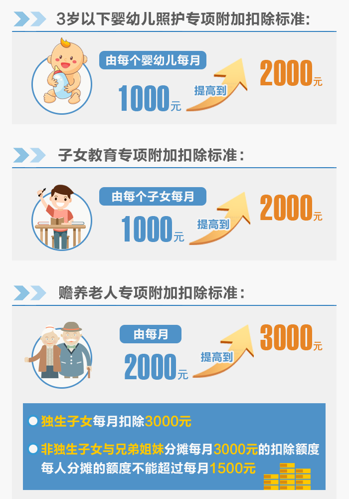 2023年1月,国务院发布了一则《对于提高个东说念主所得税联系专项附加扣除轨范的见告》,决定提高3岁以下婴幼儿照护等三项个东说念主所得税专项附加扣除轨范。将3岁以下婴幼儿照护专项附加扣除轨范、子女训诫专项附加扣除轨范与抚育老东说念主专项附加扣除轨范,折柳提高1000元。