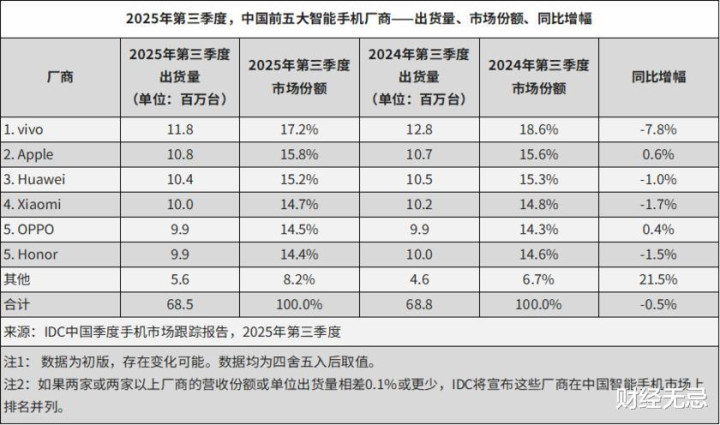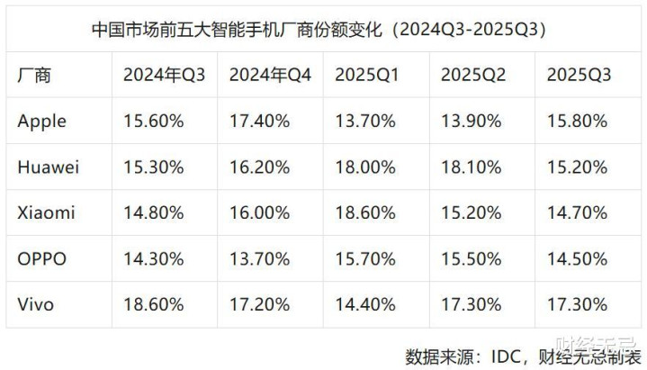 2024年苹果出货量下滑900万台,2025年一、二季度中国市集份额永久游荡在第五位,这被视为国产手机品牌的解围窗口期,华为、小米、vivo、OPPO均试图收拢这一机遇。