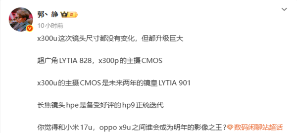 [CNMO科技音信]近日,稀薄码博主爆料称,vivoX300Ultra相较于上代X200Ultra,传感器尺寸并没变化,不传奇感器陶冶擢升远大。其中,X300Ultra超广角接收LYTIA828传感器,该传感器为X300Pro的主摄传感器。