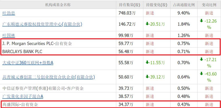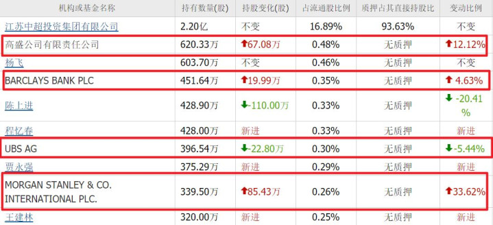 瑞银新进234万股;摩根斯坦利新进205万股;高盛加仓1.39万股,所有执有183万股;巴克莱新进160万股。分散位列第四、五、七、八大畅达鼓动。