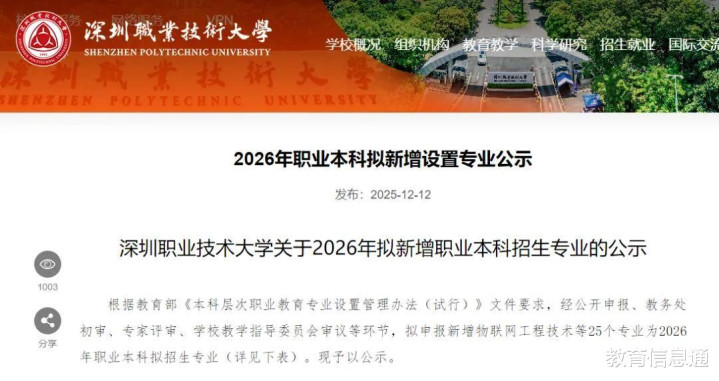 12月12日,深职大发布《深圳工作时期大学对于2026年拟新增工作本科招生专科的公示》,拟讲演新增物联网工程时期等25个专科为2026年工作本科拟招生专科。